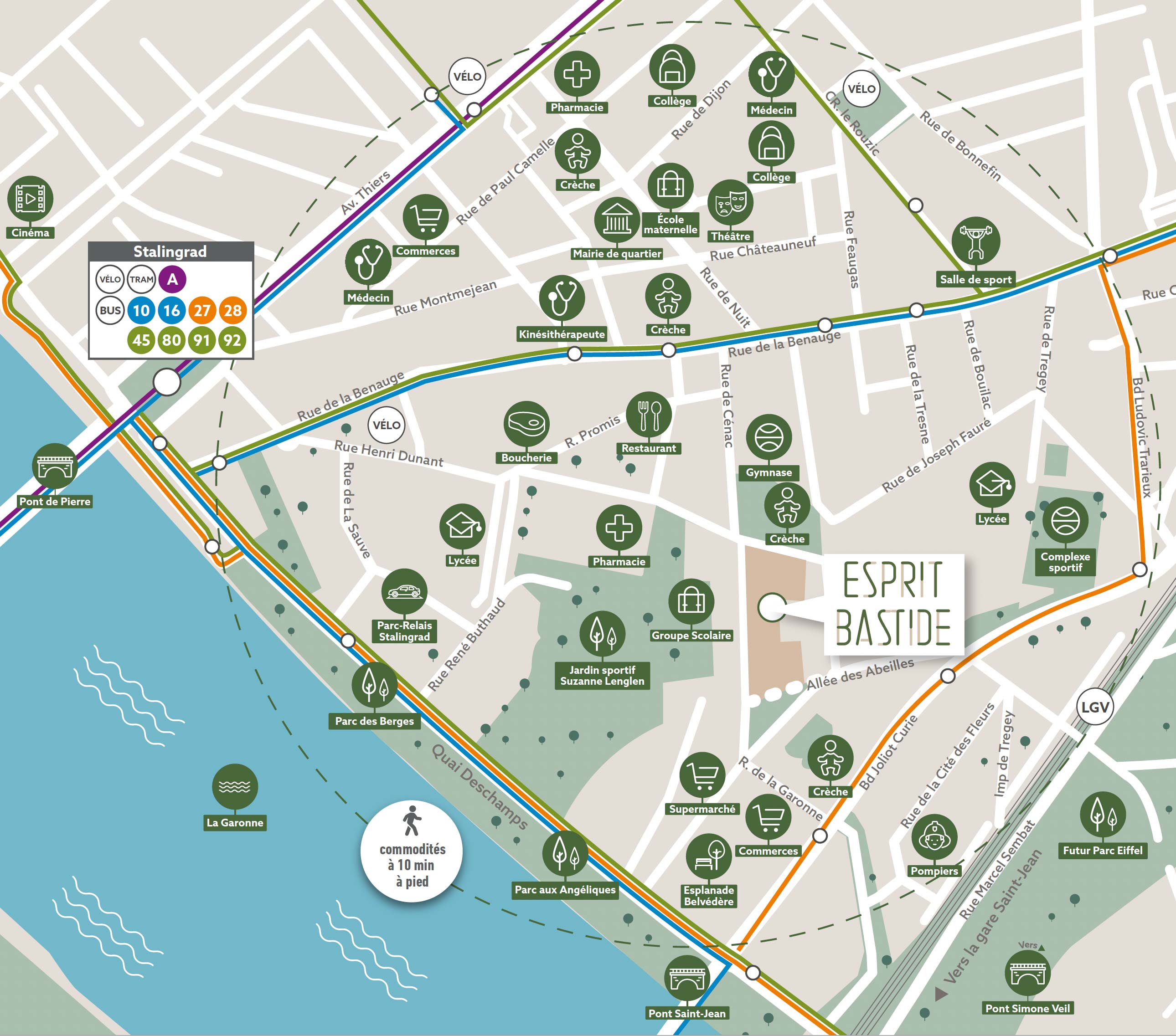 La résidence ESPRIT BASTIDE est installée au sein du nouveau quartier Deschamps-Belvédère, entre le pont de Pierre et l'Allée Deschamps à Bordeaux.
