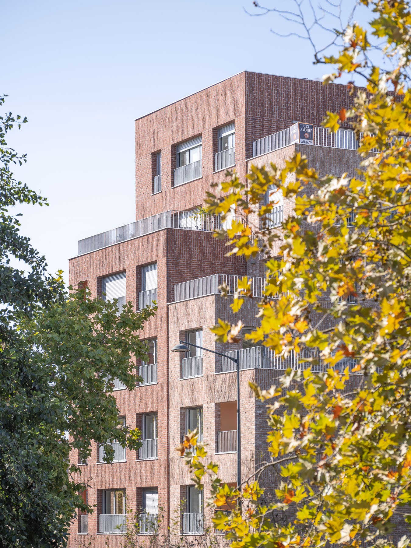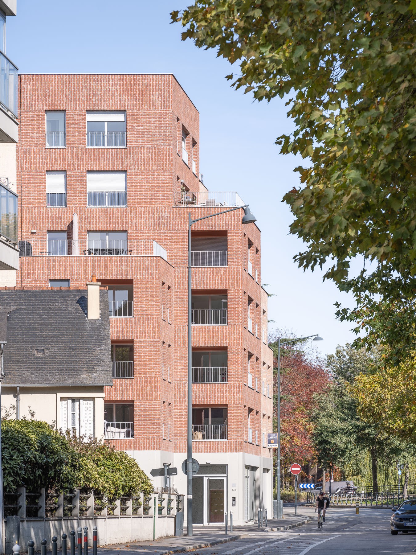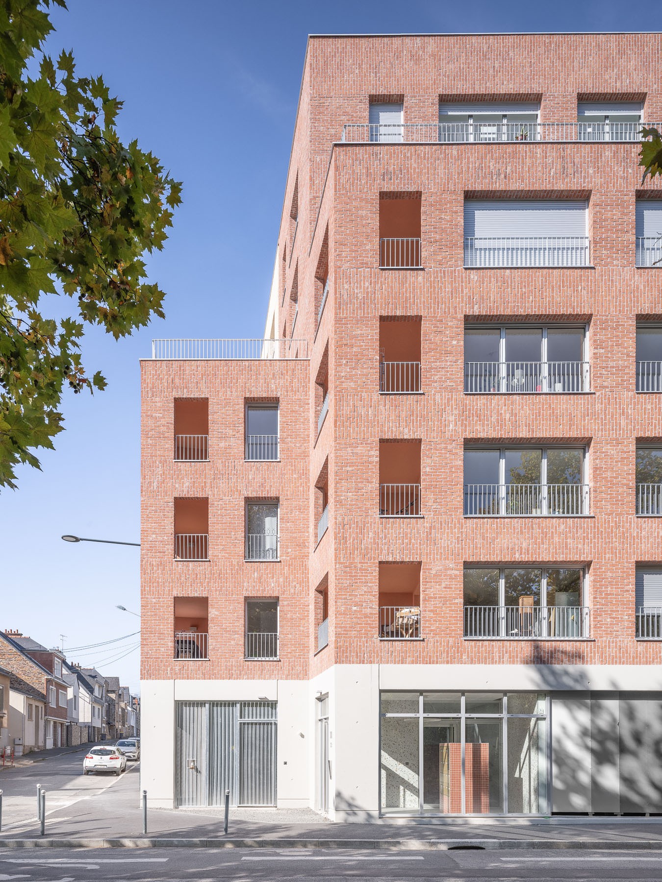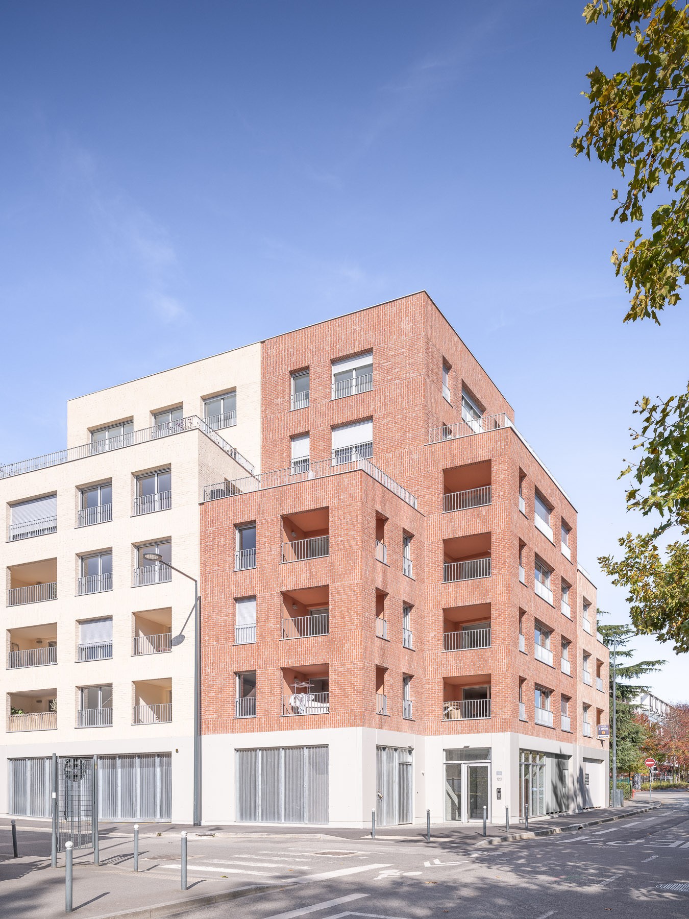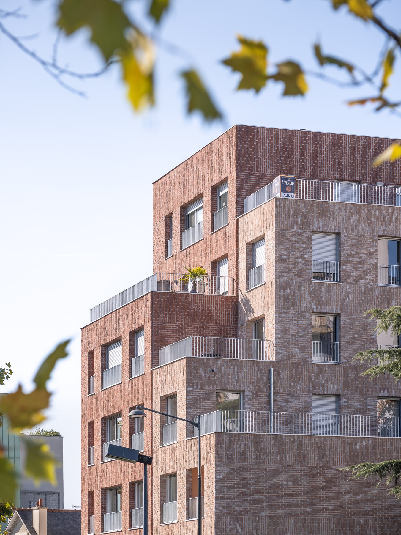 Le projet offre une impression de plusieurs volumes : un jeu de tonalité et de texture, ainsi que des toitures terrasses habitées viennent alors individualiser le caractère de chaque logement.