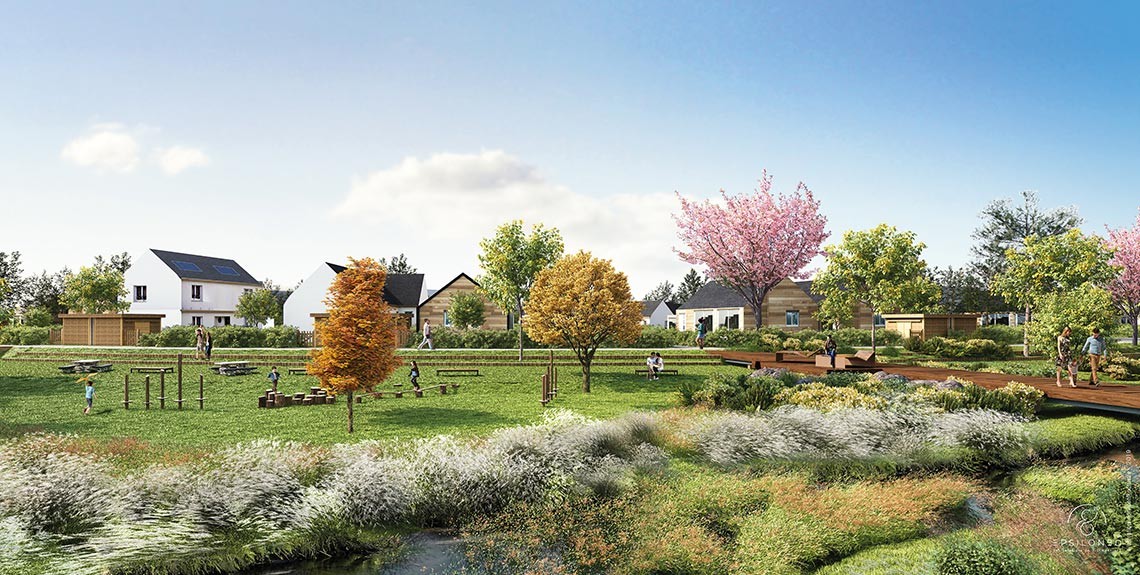 "Ce nouveau lieu de vie s’ouvre en belvédère sur le grand paysage. Le quartier redessine une nouvelle façade urbaine et propose des ambiances paysagères intimistes, en lien avec le ruisseau de la Viennais et le maillage bocager ceinturant l’opération. Ponctué de jeux, d’espaces plantés et de bassins humides, un parc linéaire se déploie en plateau et devient le support des espaces de vie du quartier. En connexion immédiate avec le mail piétonnier transversal qui relie les écoles, les commerces et équipements publics, le nouveau quartier vient épouser la frange sud de la commune." Anaïs Quesnelle - SELARL D'ARCHITECTURE CLENET BROSSET BNR - Rennes (35)